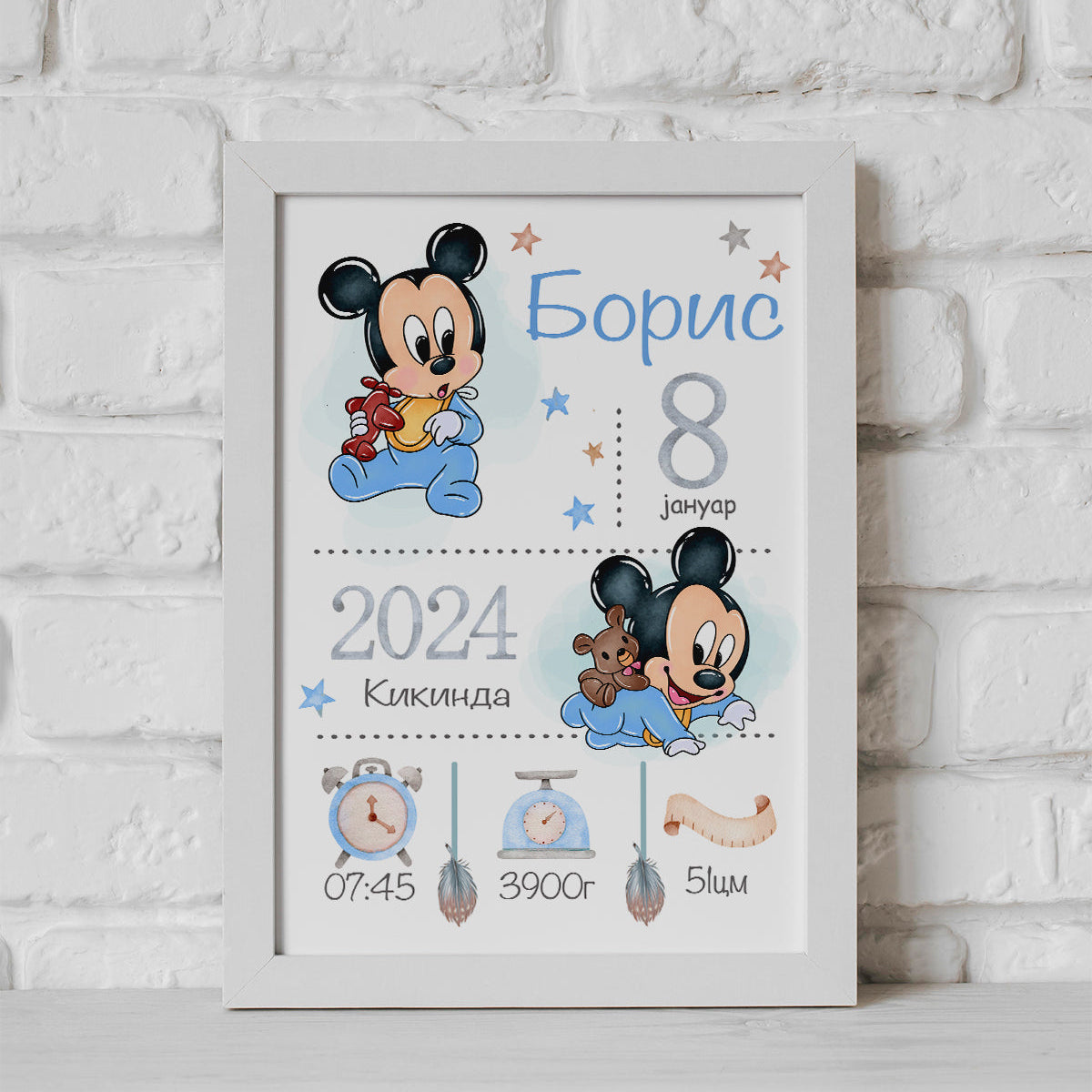 Za izradu koristimo visoko kvalitetni 255 gramski sjajni papir koji se postavlja u beli ram sa zaštitnim staklom. Ram može da se postavi na policu ili okači na zid.